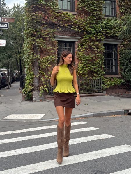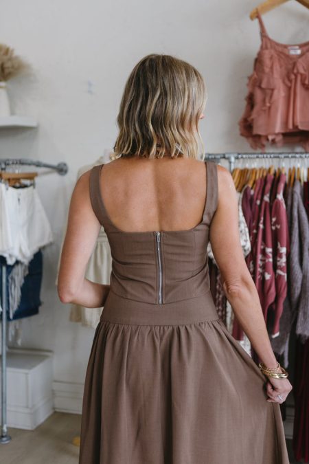 Details Brown woven topZipper to backSleevelessSquare necklineCroppedFully lined Materials and Care Self: 95% polyester, 5% spandexLining: 100% polyesterDry clean only