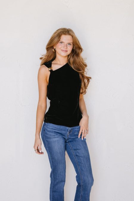 Details Black velvet topHidden side zipperAsymmetrical necklineFully linedSleevelessGold tone hardware Materials and Care Self: 94% polyester, 6% spandexLining: 93% nylon, 7% spandexHand wash coldLine dry All sale items are considered final sale.