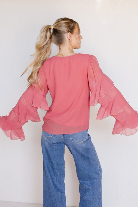 Details Woven topLong statement puff sleevesButton down frontElastic cuffs with rufflesRelaxed bottom hemOversized, flowy fit Materials and Care 75% rayon, 25% polyesterHand wash coldHang to dry
