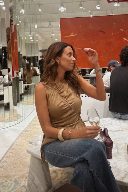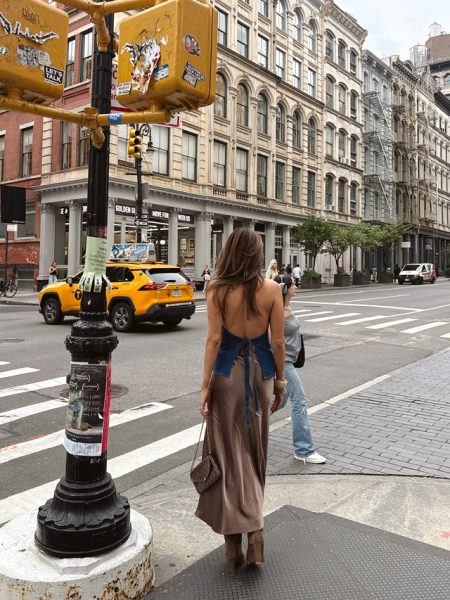 Details Denim vestSleevelessGold buttons down frontHalter necklineOpen back with tie closure Materials and Care Self: 75% cotton, 23% polyester, 2% spandexHand wash coldLine dry All sale items are considered final sale.